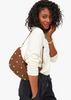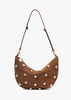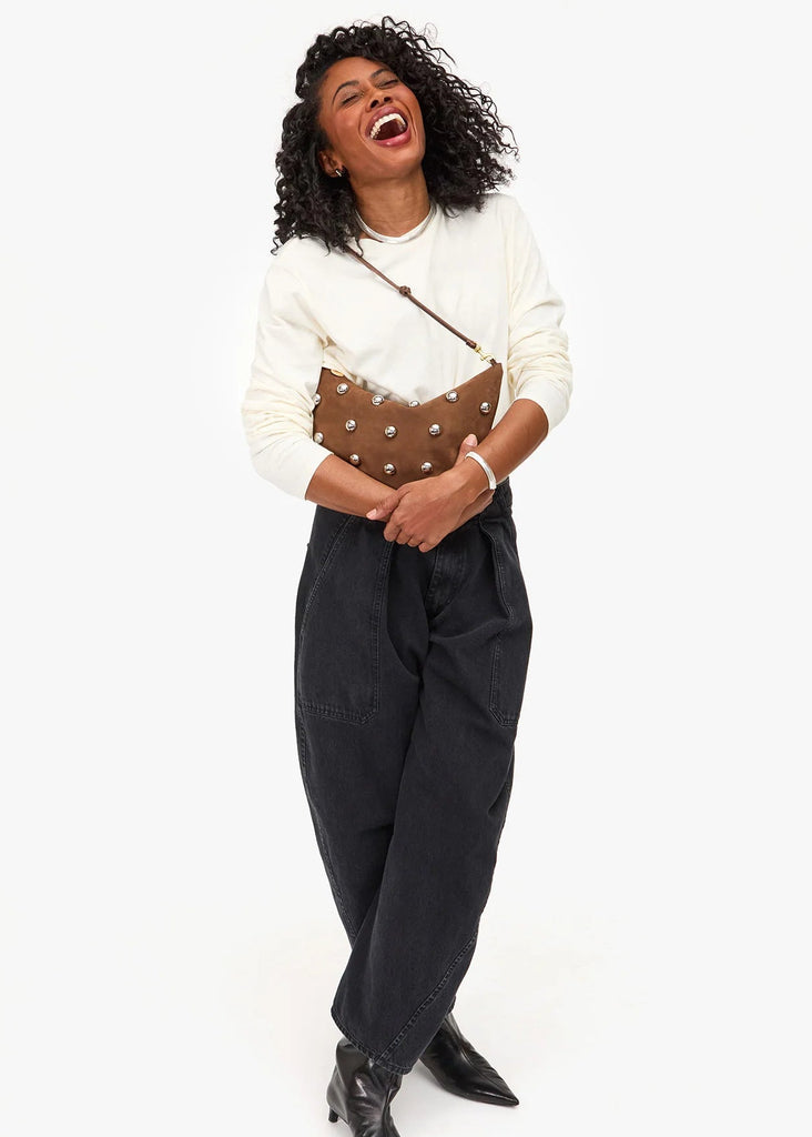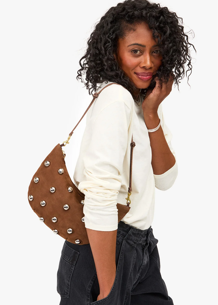 A compact Clare V. clutch in studded nubuck leather with a velvety finish. Holds essentials—phone, keys, wallet, and sunglasses—with a secure zipper and knotted shoulder strap. Note: nubuck's natural finish requires care to protect against water and staining.