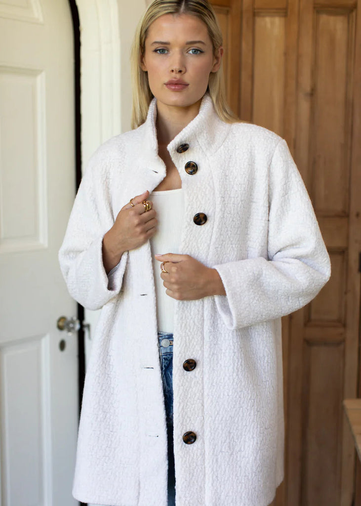 Emerson FryClassic, mid-length ivory coat that brightens up your cold-weather outfits and adds a layer of interest that your darker coats can't. This cozy version features a textured boucle fabrication that adds both warmth and styling interest.