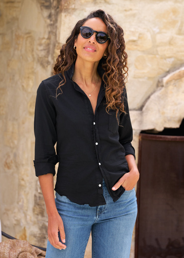 Frank & EileenBarry—the first-born button-up—is the closet essential. Classic in style and sharply tailored to hug your waist and back, Barry curves in all the right places. Notice the signature single pocket, hip-skimming hemline, and bust-flattering button placement.