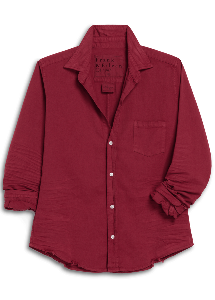 Frank & EileenFrank & Eileen's iconic button-up shirt, expertly tailored to flatter with an hourglass silhouette, curved back seam, and strategically placed buttons. Features a hand-distressed raw hem, signature chest pocket, and button cuffs for timeless versatility.