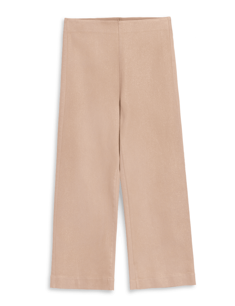 A wide-leg pull-on jean in Italian waxed denim with a hidden contour waistband. The streamlined design eliminates zippers and hardware for effortless, polished comfort.