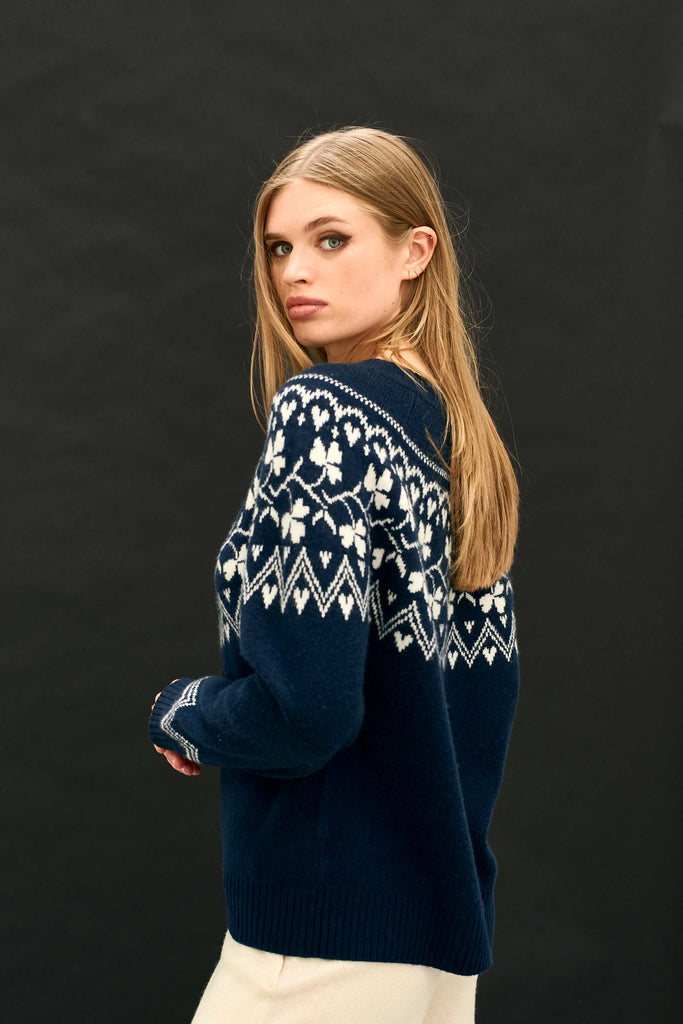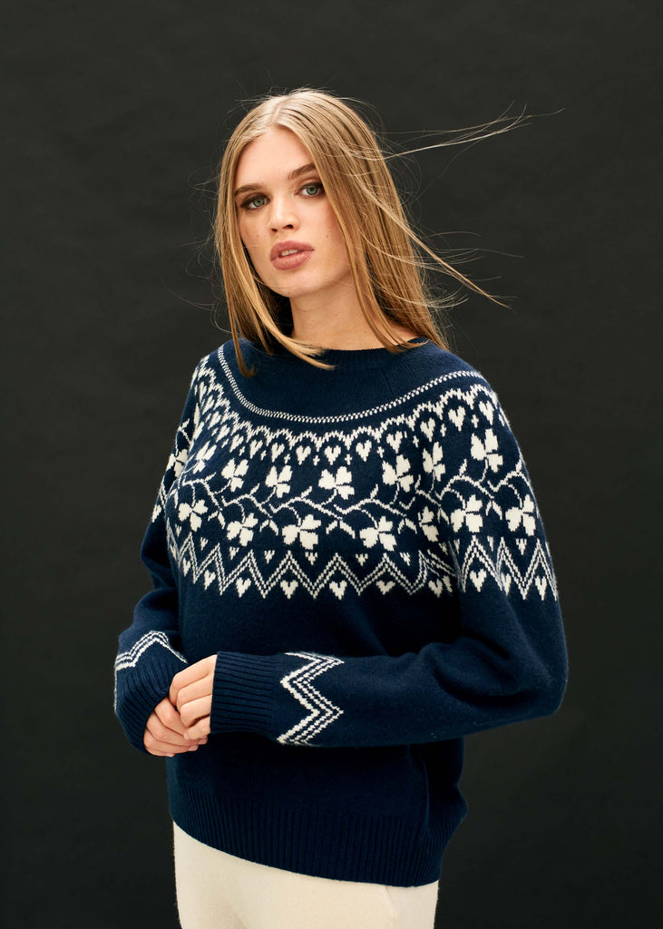 Jumper 1234Jumper 1234 cashmere and wool jumper. Navy crew neck jumper in our heavier weight cashmere and wool with a stone clover pattern on the yoke, back and front!