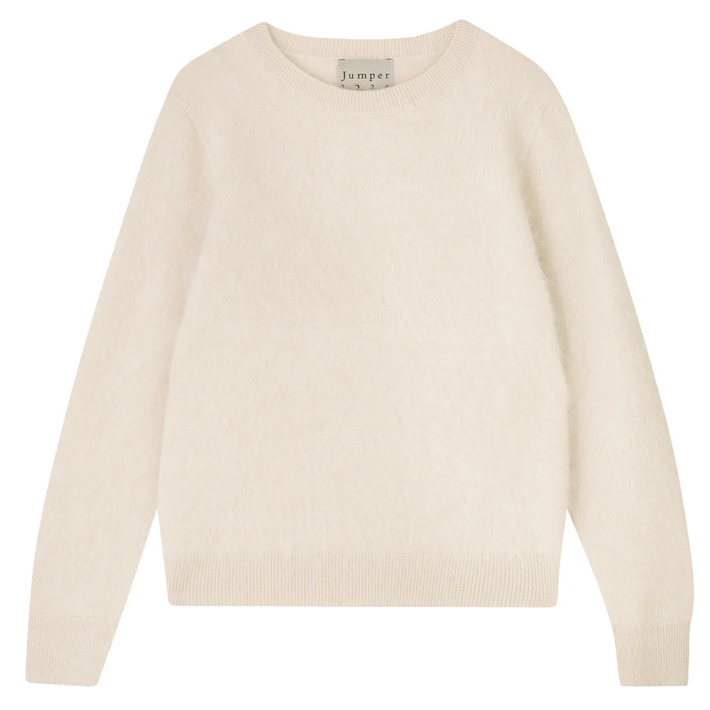 Jumper 1234A Brushed cashmere crew neck sweater in cream. Brushed cashmere is super soft, once the garment is knitted it is then brushed to give it a more fluffy handle. We're in love with this sweater, and it's true to size.