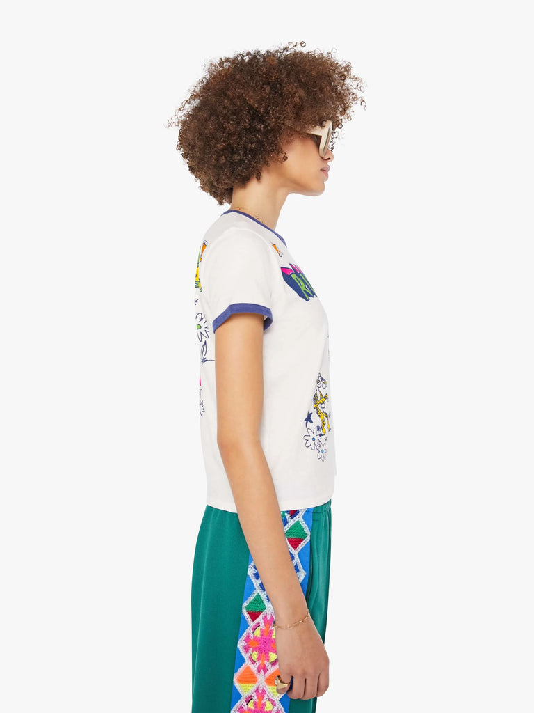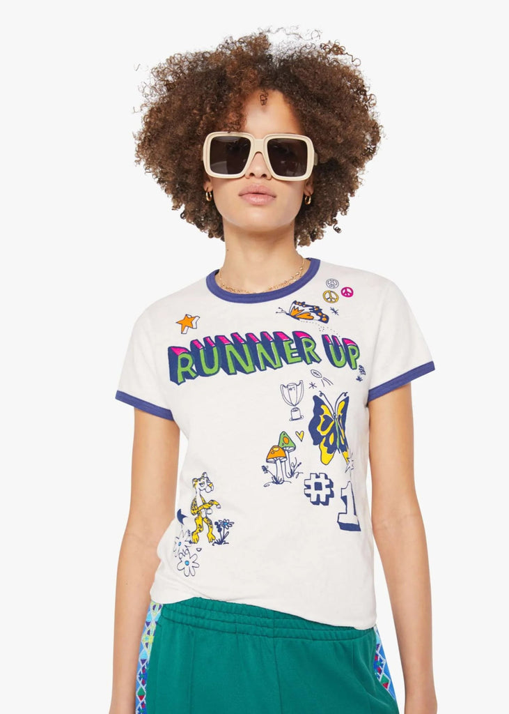 Second is the best. A crewneck tee with extra-short sleeves and a slightly shrunken fit. Made from a recycled cotton blend in white with navy trim, The Itty Bitty Ringer in Runner Up features hand-drawn 3D text and colorful doodles throughout.