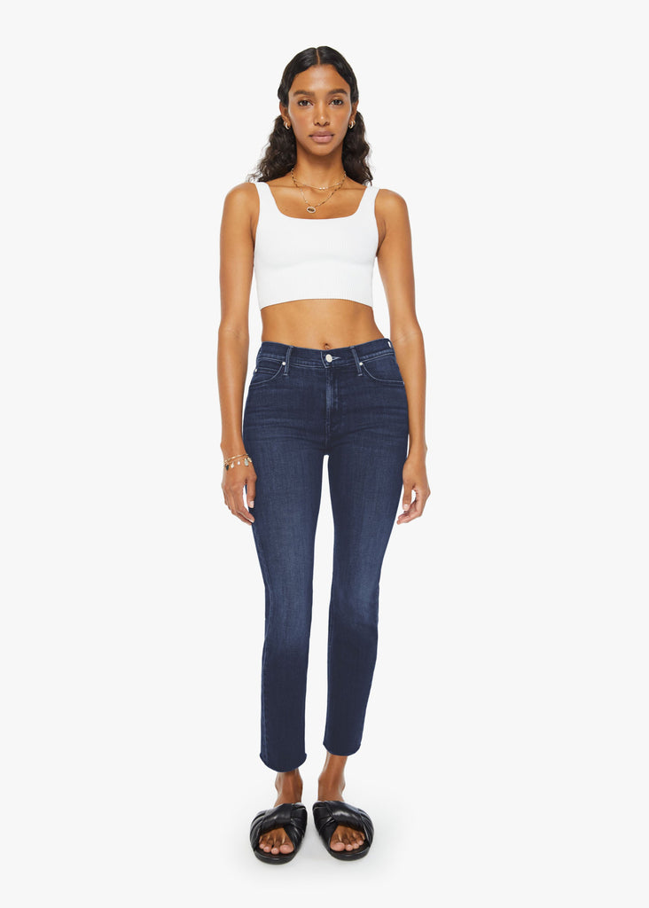 Mother DenimMother’s iconic mid-rise straight-leg jeans, the Dazzler Ankle, feature a clean hem hitting at the ankle. Crafted from stretch denim, the Chip On My Shoulder style presents a deep blue wash with understated fading and whiskering for a refined, effortless look.