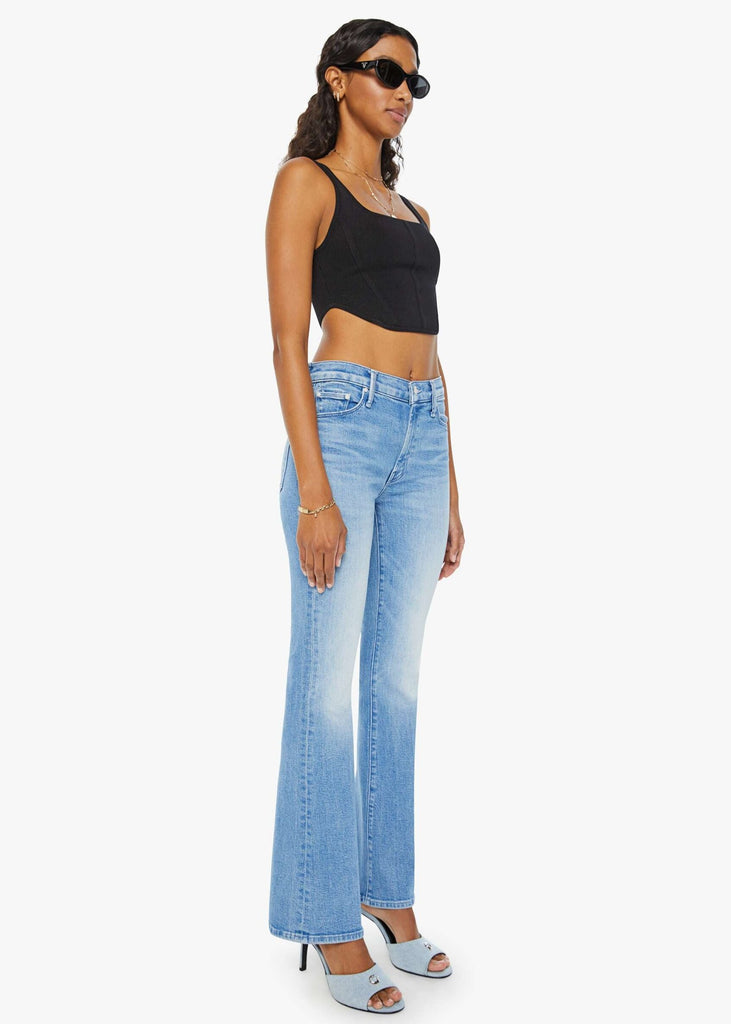 MotherVacation inspiration. This cult-favorite flare jean has a mid rise with a 31-inch inseam and a clean hem. Made from a recycled-cotton blend with a touch of stretch, Mediterranean Muse is a light blue wash with whiskering and fading at the knees. Made in Los Angeles.
