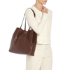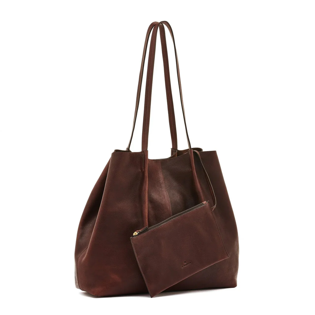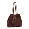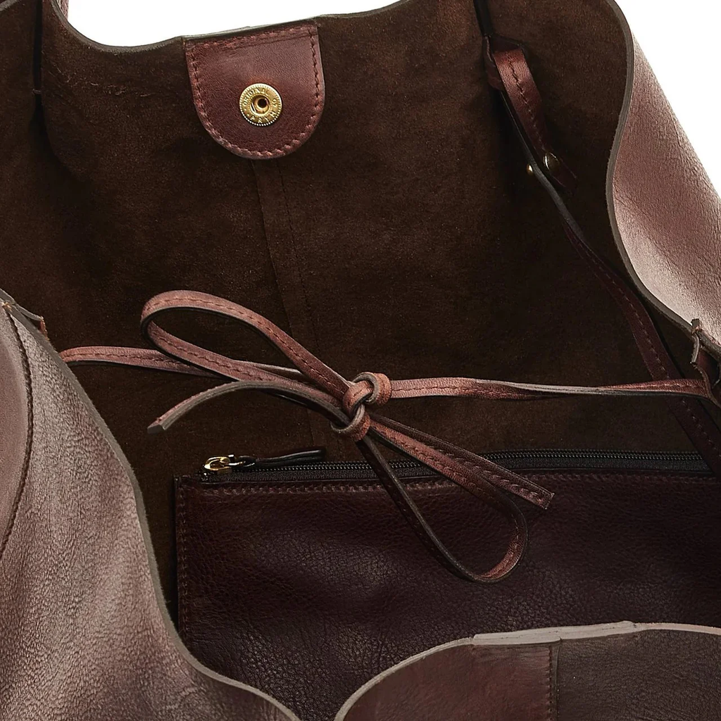 IL BisonteTote bag with an essential and timeless design defined by supple vegetable-tanned leather and soft pleats. Pleats are hand-stitched in place. Snap-button closure and two leather laces make it even more secure. The suede-lined interior contains a pouch that has a removable drawstring with stud and zip closure with leather pull hand-stitched in place.