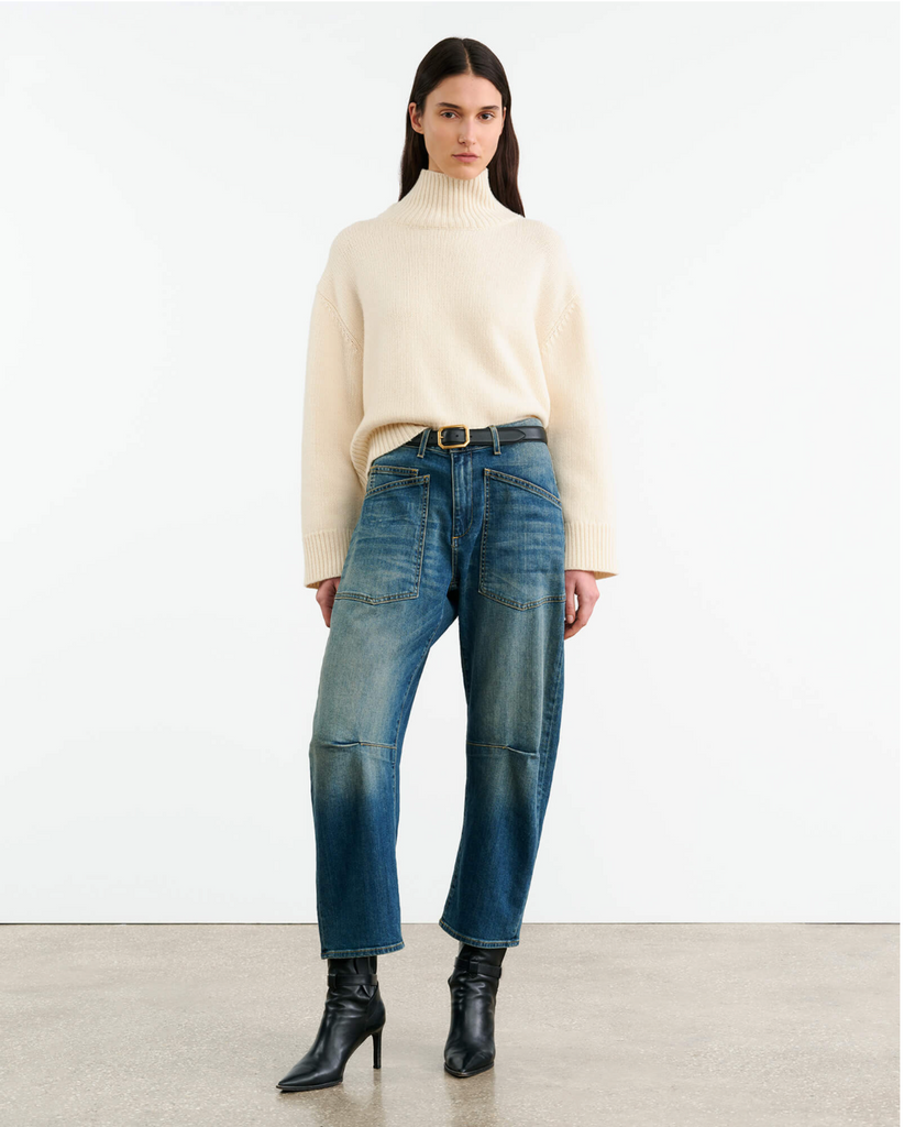Nili LotanWe love this heavyweight and oversized boxy funnel neck sweater in Italian lambswool. High neck designed to be worn up, but easily able to fold over depending on your preference. Dropped shoulder, ribbing along neck, sleeve and hem. Signature center back cable knit detail. Fully fashioned along arm hole and shoulder.