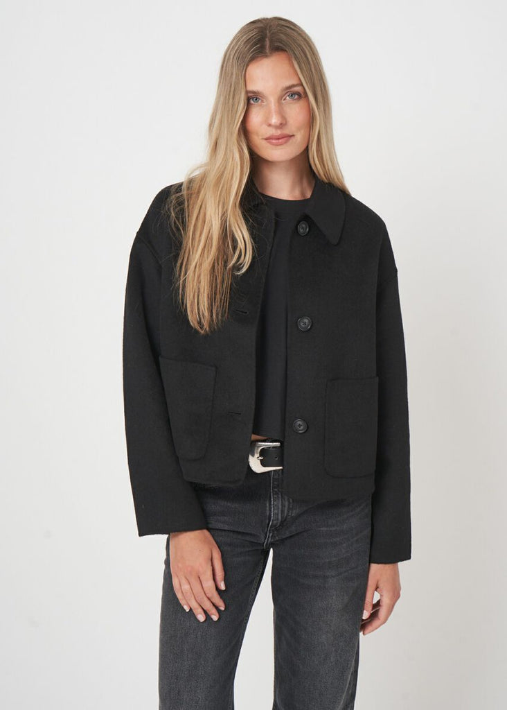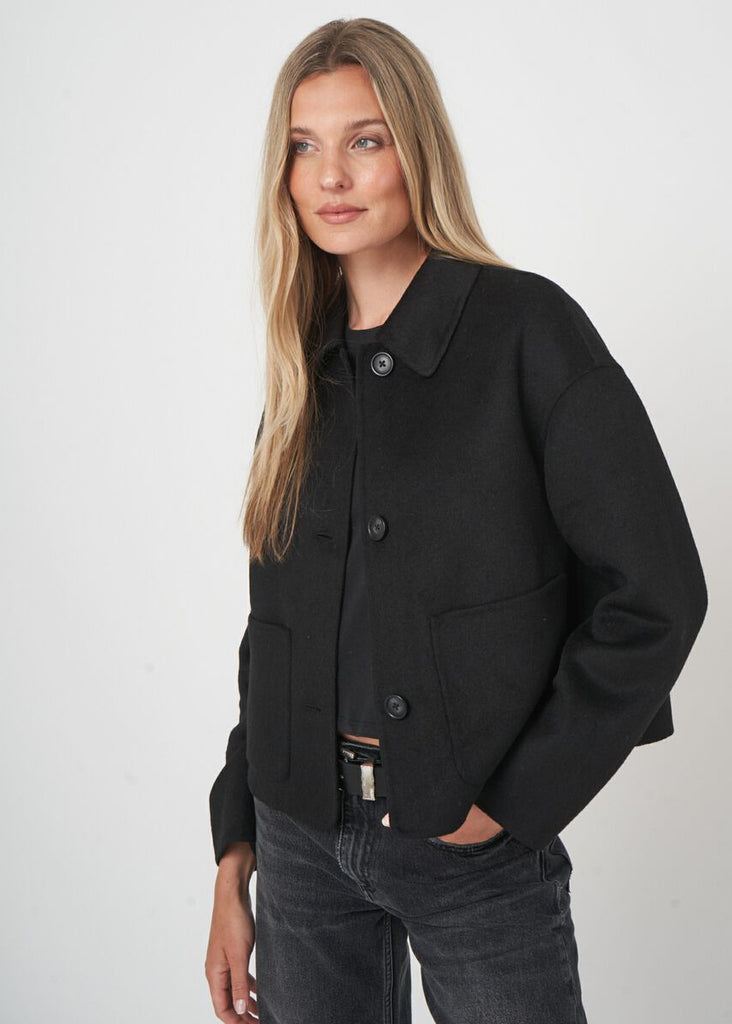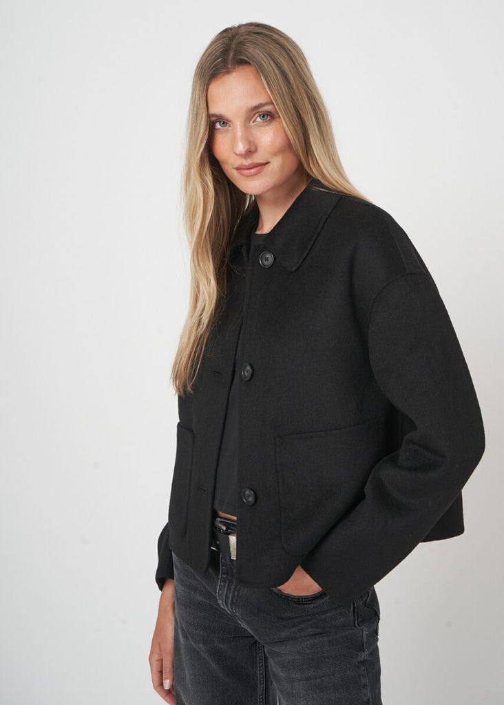 A wool blend jacket with a shirt collar and boxy silhouette. Three-button front placket and generous patch pockets complete this refined layering essential.