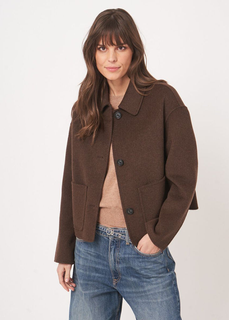 Repeat CashmereA wool blend jacket with a shirt collar and boxy silhouette. Three-button front placket and generous patch pockets complete this refined layering essential.