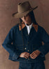 A reimagined barn coat in structured midnight rinse denim with a distinctive corduroy collar. The cropped, swingy silhouette features snap-front closure with hidden zipper and patch pockets, offering refined versatility for layering with trousers, skirts, or denim.
