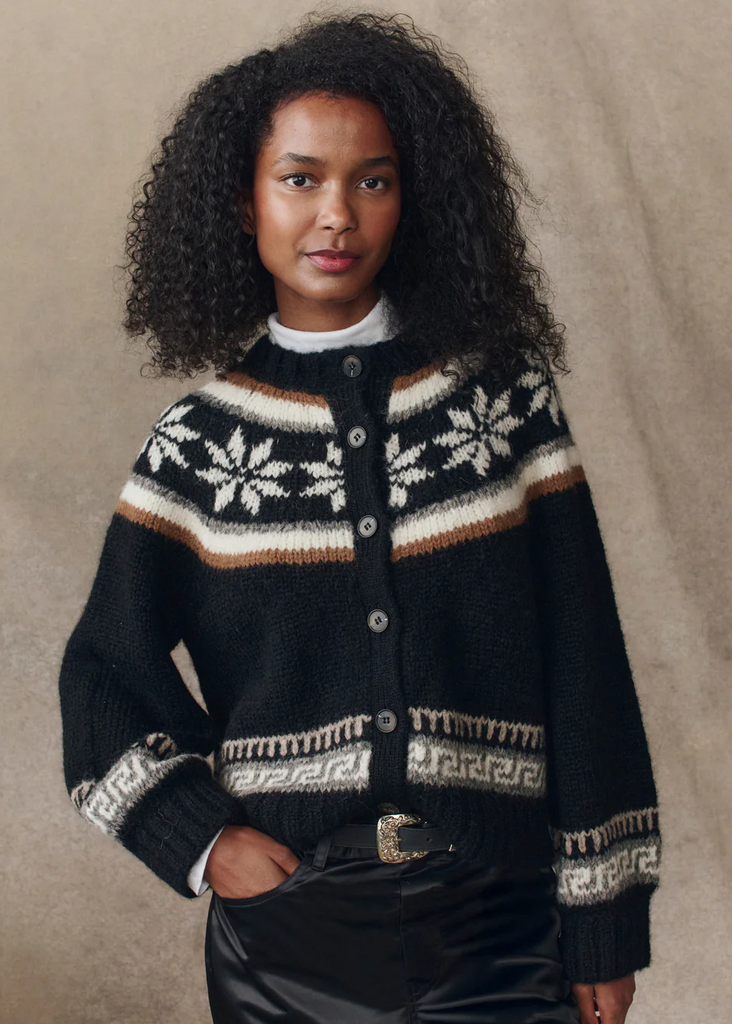 The GreatKnit from lofty alpaca yarn, this relaxed cardigan showcases a Nordic snowflake pattern inspired by heritage hand-knits. Finished with horn buttons, blouson sleeves, and rib trims, it’s an instant heirloom.