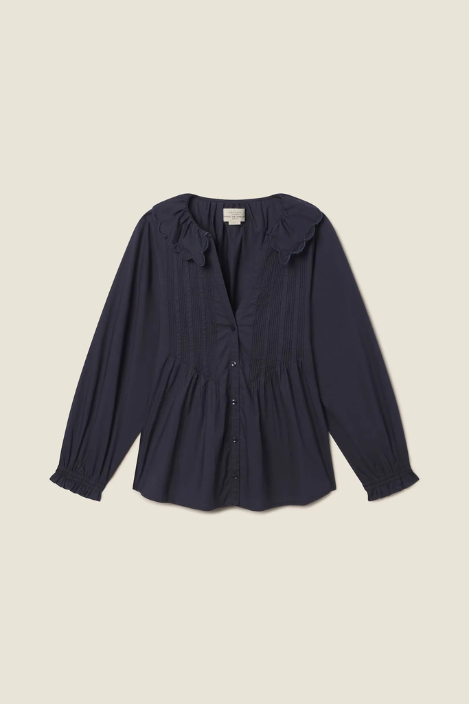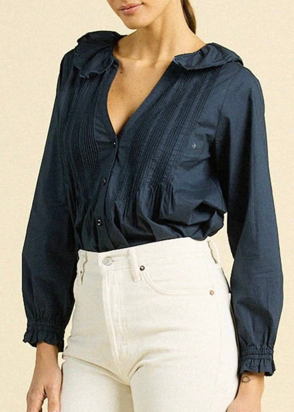 TROVATAThe Francine V-neck Blouse by Trovata is a navy, long-sleeve top made from soft 100% cotton poplin. Featuring elastic wrists for comfort and a subtle textured pattern, it pairs perfectly with jeans and slides for a stylish summer look.