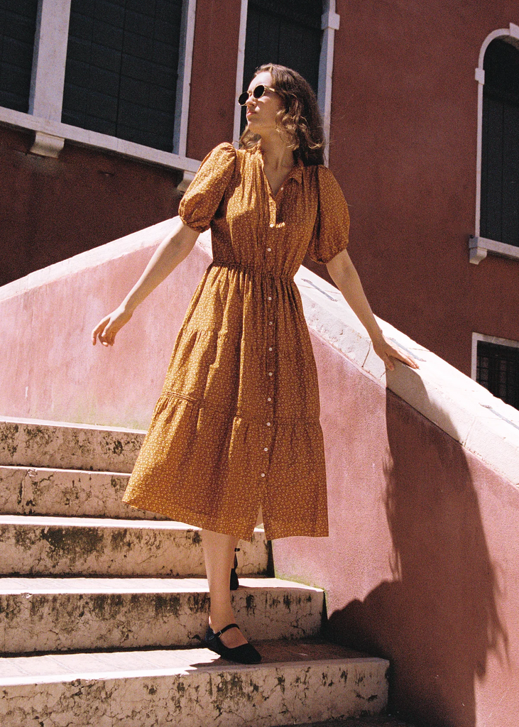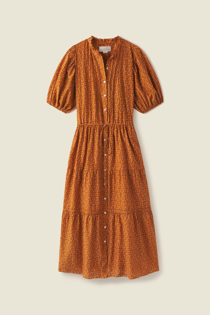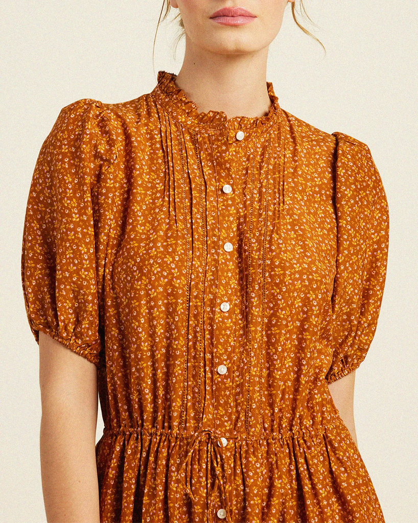 TROVATAThe Hildie Dress features a multi-tiered skirt, self-fabric waist tie and front pintucks that are designed to capture attention and evoke a sense of vintage charm. Hildie features hidden side seam pockets, a front placket with antique white buttons and a standing ruffle-collar for subtle charm. Shown here in Pecan Ditsy and made from our cotton silk.