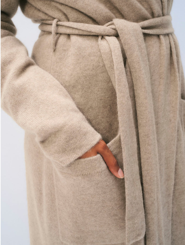 Sumptuous Mongolian cashmere robe refined through a custom wash for exceptional softness. Finished with signature hand-embroidered details at the back neck for understated luxury.