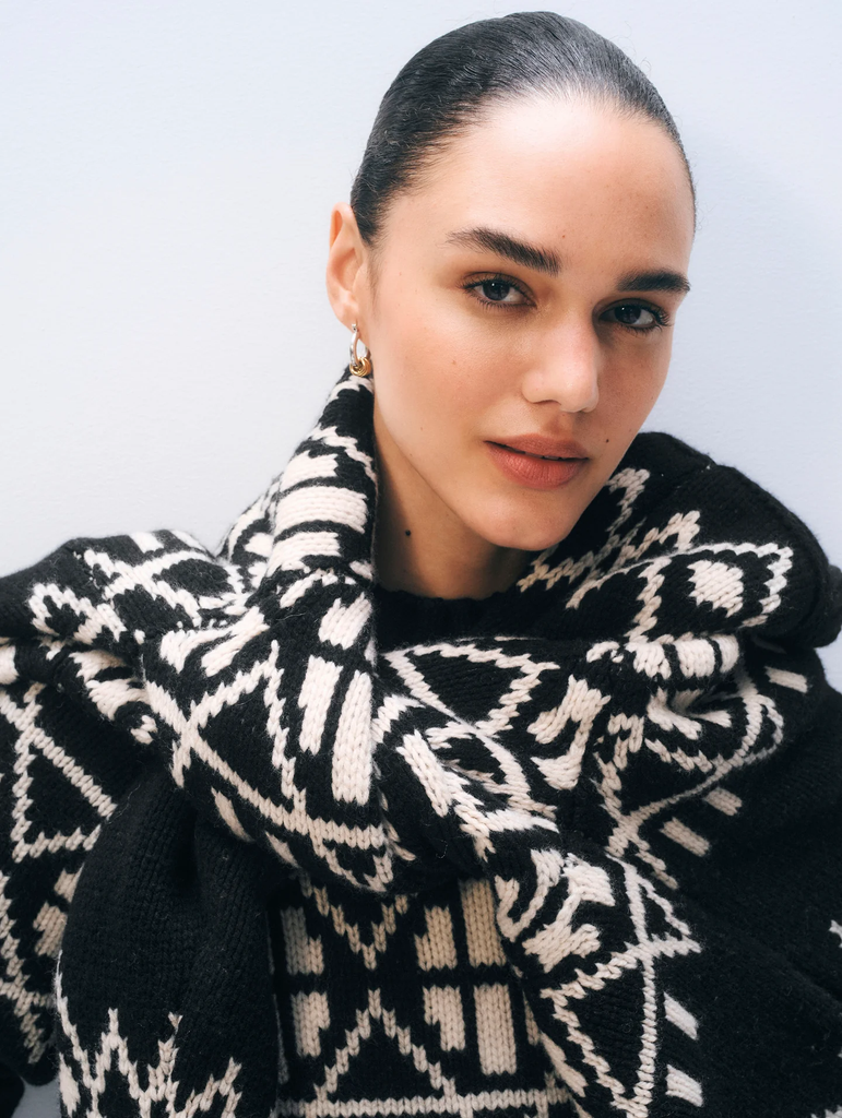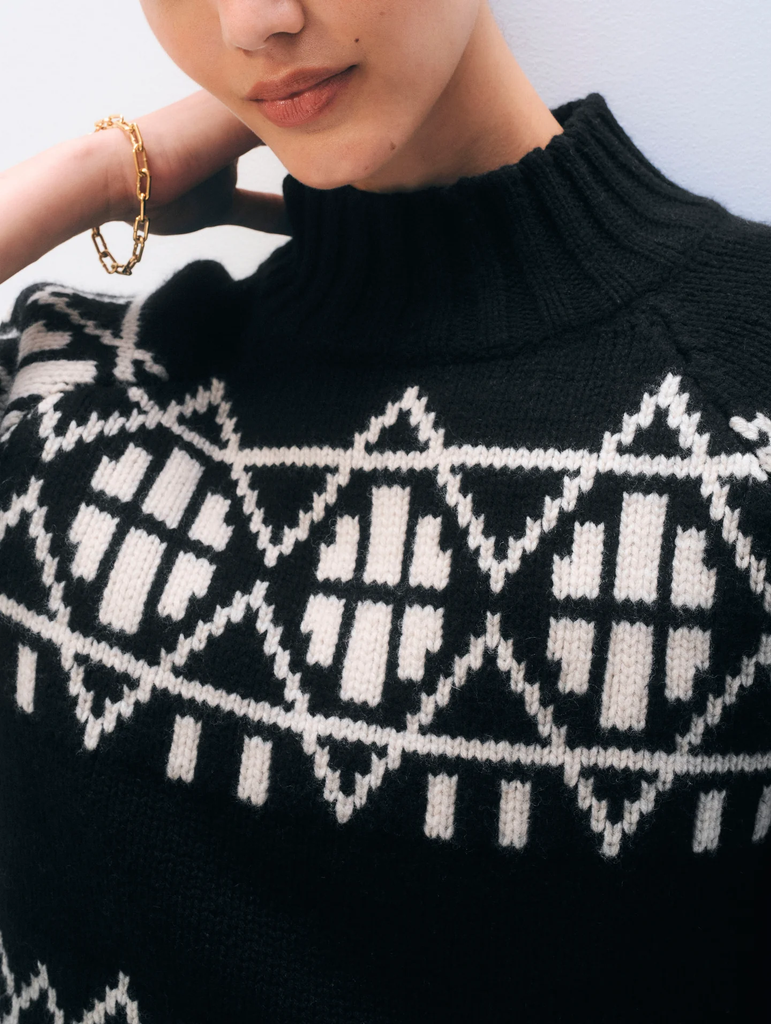 Heritage meets modern craftsmanship. Spun from 100% merino wool in a classic Fair Isle pattern, this standneck sweater holds its shape beautifully while offering soft warmth. Size up for an oversized fit.