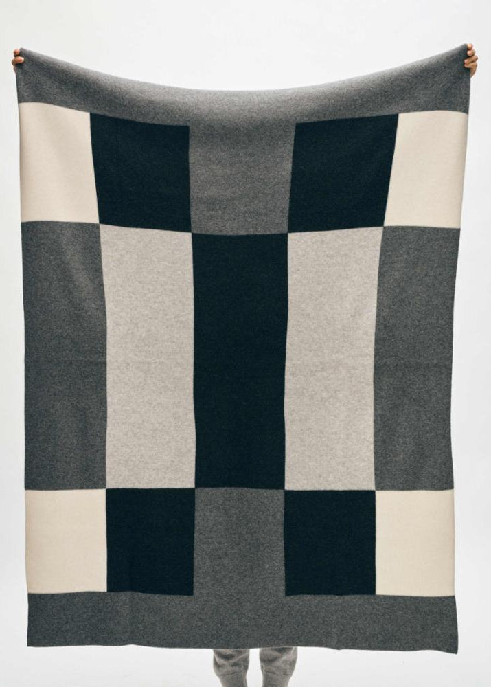 Luxurious cashmere blanket in sophisticated grey colorblock. An indulgent piece that brings refined comfort to any space.