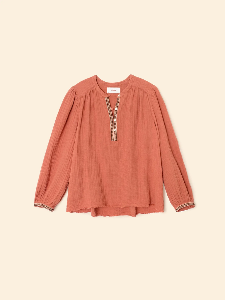 XirenaFrench allure meets California ease. Colette is made in washed double faced cotton gauze for a soft, gently crinkled feel. This easy top features multi-colored embroidery trim at the neck and sleeve cuffs, blouson sleeves, and a raw edge hem.
