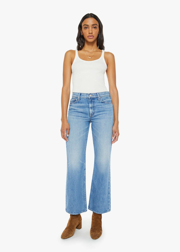 MotherHigh marks at high noon. A high-rise bootcut designed for a looser fit through the leg while fitted throughout the waist and hips with a 28.25-inch inseam. Made from semi-rigid denim, Dean's List is a mid-blue wash with whiskering and fading at the knees.
